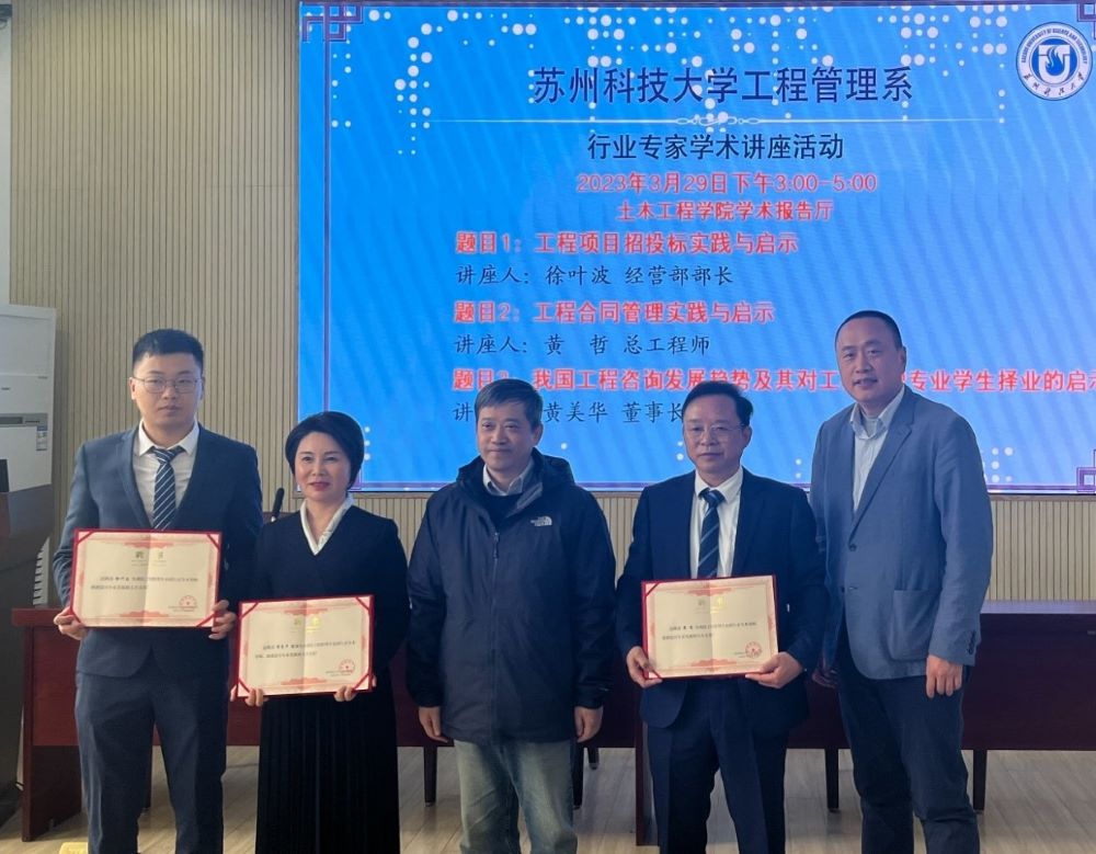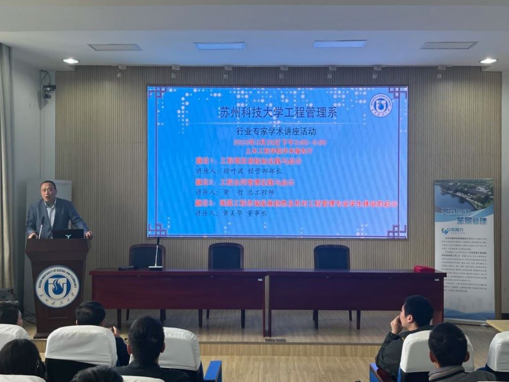 作者:张奇 图片作者:张阔豪 发布日期:2023-03-30 浏览:次为培养学生的社会适应性,增强对本专业现状和发展前景的认知,提高就业能力,2023年3月29日下午,NG28-NG28娱乐 工程管理系举办行业专家学术讲座活动。NG28娱乐 副院长范存新出席,江苏笙景工程管理研究院有限公司董事长黄美华、总工程师黄哲、经营部部长徐叶波担任主讲人。讲座由工程管理系主任张尚主持,工程管理系部分教师以及工程管理专业20级全体学生、21级学生代表参加。