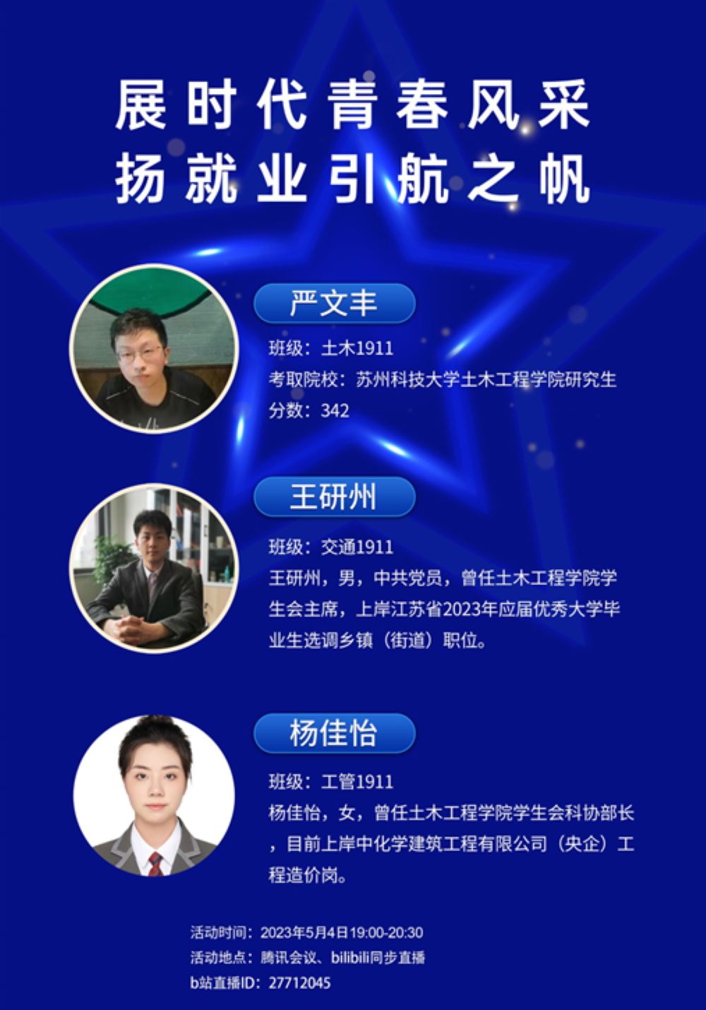 作者:许智琪 仇琦 图片作者:仇琦 发布日期:2023-05-05 浏览:次为深入贯彻落实党的二十大精神,围绕中央经济工作会议提出的“把促进青年特别是高校毕业生就业工作摆在更加突出的位置”的重要要求,引导大学生立足实际、找准定位,树立理性、平实的就业观、择业观,NG28娱乐 开展了“展时代青春风采 扬就业引航之帆”线上主题团日活动。本次活动通过腾讯会议、哔哩哔哩平台同步直播,22级全体本科生参加活动,活动由22级辅导员许智琪、仇琦主持。