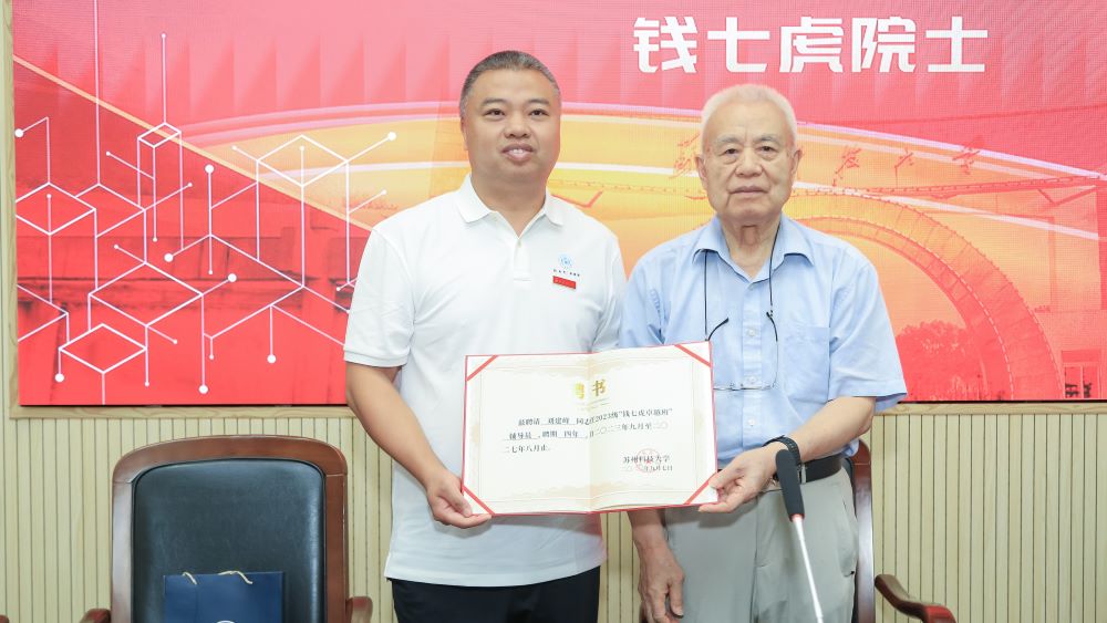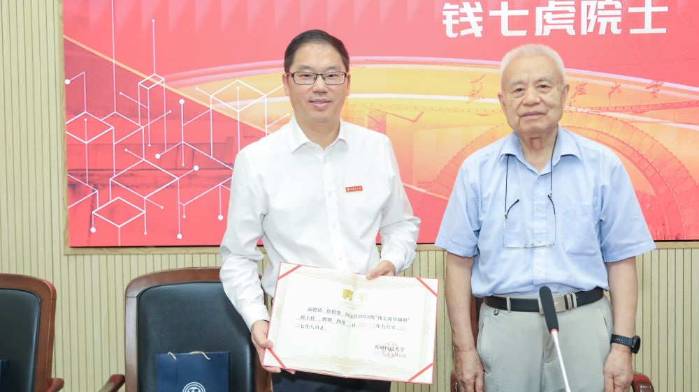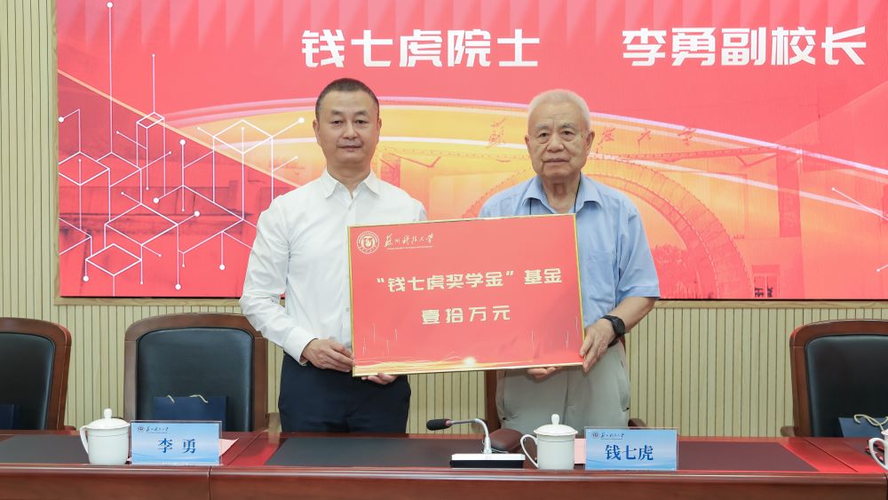 仪式上,钱七虎院士与姜朋明共同为苏州科技大学“钱七虎卓越班”及“钱七虎奖学金”基金揭牌,钱七虎院士现场题写了“钱七虎卓越班”班名及班训,为“钱七虎卓越班”的班主任、执行班主任、辅导员颁发聘书。李勇代表苏州科技大学教育发展基金会接受钱七虎院士捐赠。