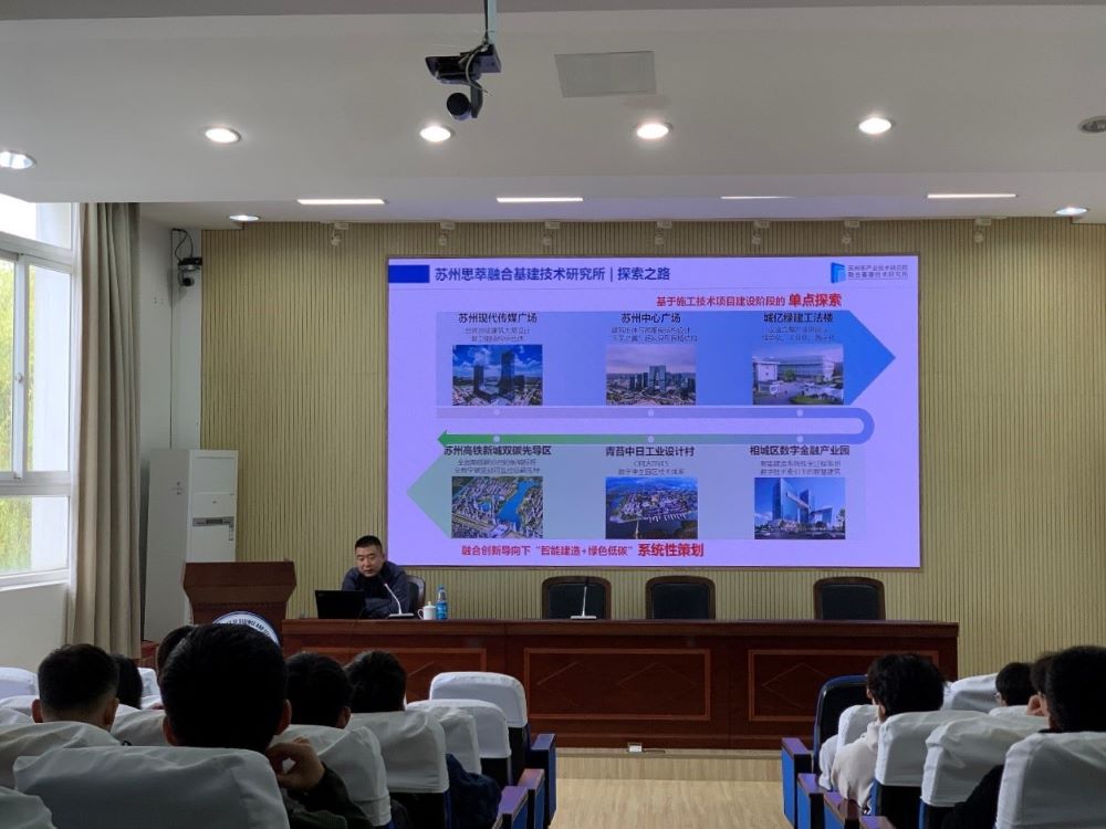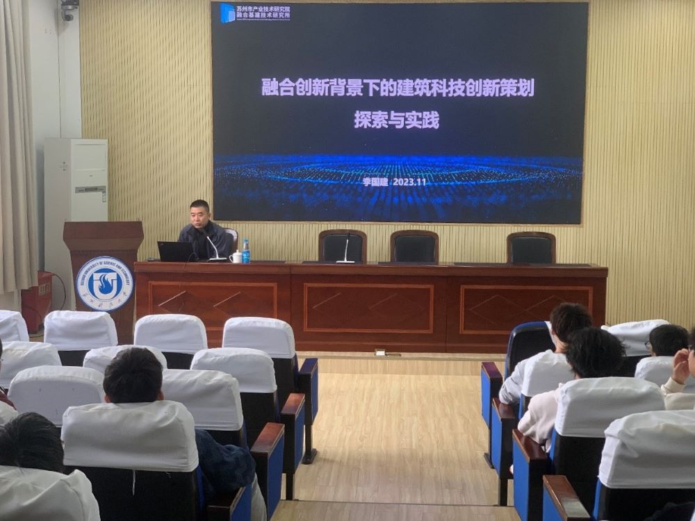 作者:吴芳 图片作者:吴芳 发布日期:2023-11-24 浏览:次为推动产教融合,促进教育链、人才链与产业链、创新链有机衔接,2023年11月22日下午,我院工程管理系邀请我校江苏省产业教授、苏州产研院融合基建技术研究所所长、中亿丰控股集团有限公司总工程师、教授级高级工程师李国建为工程管理专业大三学生带来了题为“融合创新背景下的建筑科技创新策划探索与实践”的学术报告。