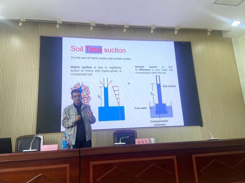 Hossam Abeul-Naga教授以其热情洋溢、幽默风趣、思路清晰等特点,吸引了在场所有人的关注。他丰富的知识、深入浅出的讲解以及在科学研究方面的创造力,使得此次讲座在师生中引起了广泛的讨论和赞誉。在报告结束后,他认真、耐心地回答了师生们提出的各种科学问题。这次报告不仅提高了师生们对非饱和土力学的认识与理解,还拓宽了他们的学术视野。