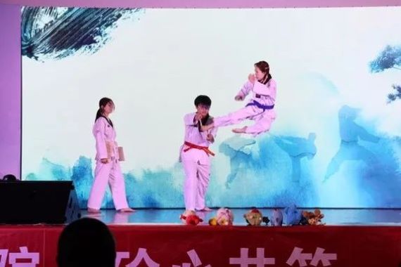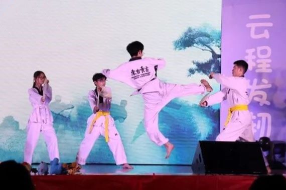 首先上台的是跆拳道社团,跆拳道舞动的身姿如同一幅流动的画卷,展现出力量与美的完美结合。这是少年学子们永远追求的理想。