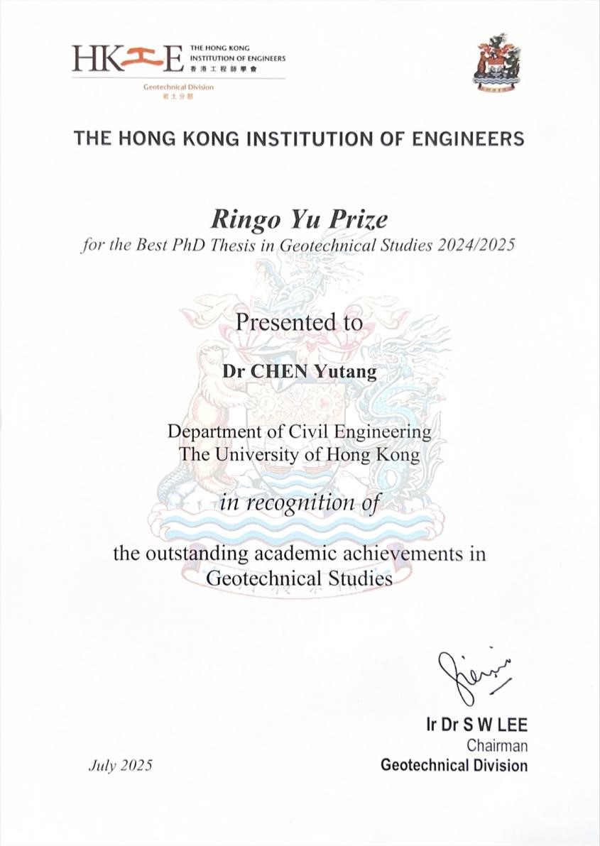 香港工程师学会最佳岩土工程博士论文奖设立于2006年,以Ringo Yu博士的名字命名,旨在表彰青年学者在岩土工程方面的杰出学术成就。目前,博士论文相关成果在岩土工程顶刊《Geotechnique》《Journal of Geotechnical and Geoenvironmental Engineering》和《Engineering Geology》等期刊发表。