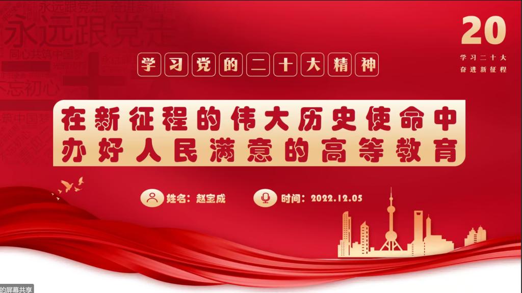 作者:田鹏许 黄国华 发布日期:2022-12-06 浏览:次为深入学习贯彻党的二十大精神,全面加强对党员学习活动的组织领导,推动党的二十大精神入脑入心,2022年12月5日晚8时,NG28娱乐 常务副院长赵宝成通过腾讯会议为工程管理系教工党支部全体党员宣讲党的二十大精神,讲授专题党课——《在新征程的伟大历史使命中办好人民满意的高等教育》。