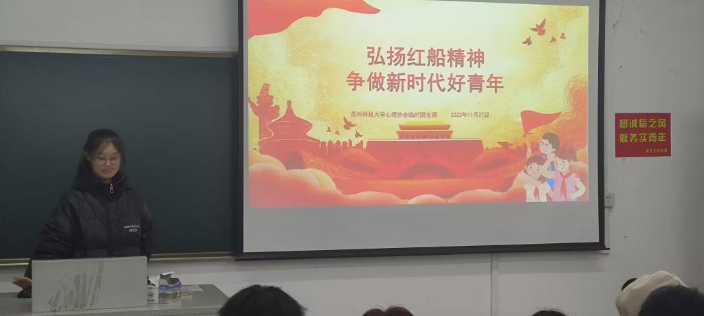 发布日期:2023-11-08 浏览:次2023年11月8日,为了让“红船精神”所蕴含的当代价值进一步彰显,引导同学们重温党的百年辉煌历史,感受党的奋斗历程和伟大成就,NG28娱乐 心理协会在苏州科技大学江枫校区二教307开展了“红船精神”学习活动。