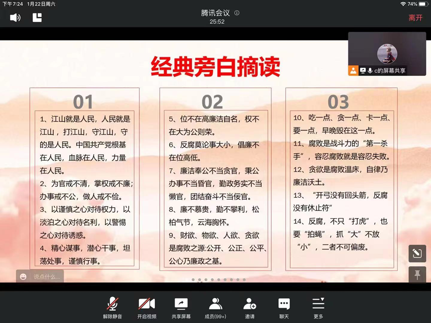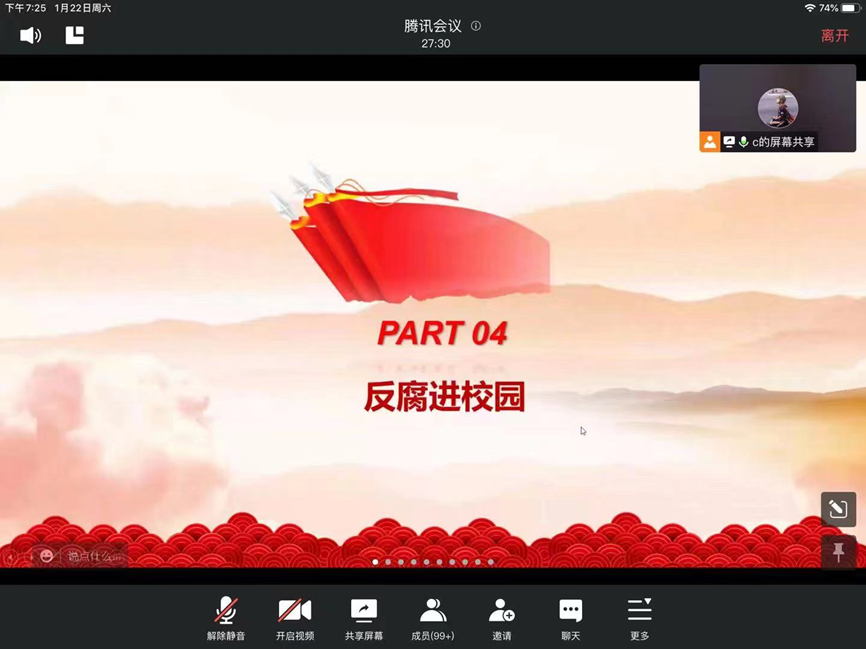 发布日期:2022-01-27 浏览:次2022年01月22日,NG28-NG28娱乐 研会在腾讯会议组织开展对腐败“零容忍”主题活动。本次活动主题为“以清正廉洁为荣,以贪污腐败为耻”。不忘初心、牢记使命,砥砺前行,坚定理想信念,对反腐“零容忍”。此次开展对反腐“零容忍”教育活动,是为日后工作打下良好的理论基础。积极引导研究生党员、研究生会成员及研究生班级学生干部深入推进党风廉政建设和反腐败斗争,积极参与活动,使反腐倡廉蔚成风气。