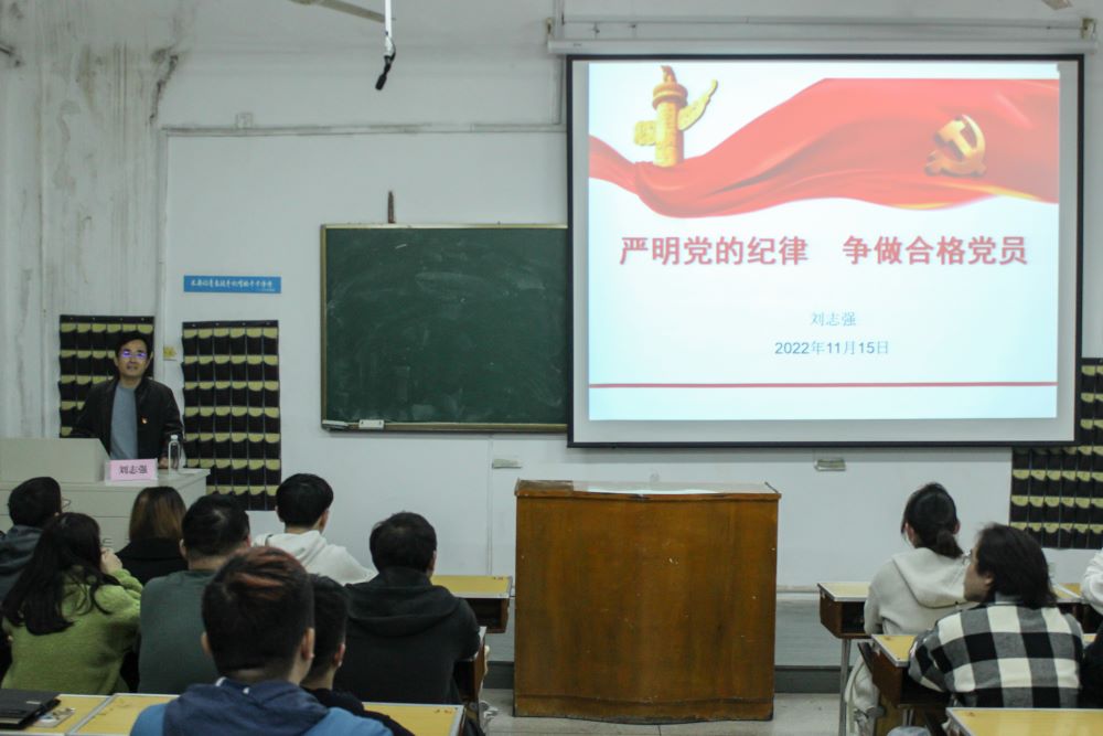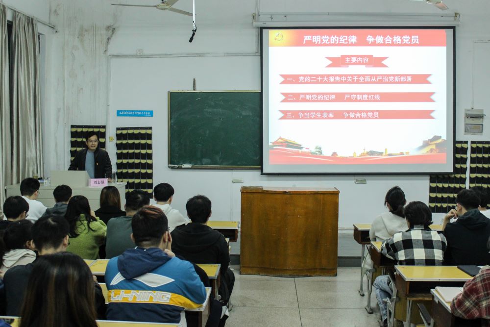 刘志强从党的二十大报告关于全面从严治党新部署出发,向预备党员们讲述了报告在总结党的建设经验上的新提法、在剖析问题上的新发现、在战略部署上的新要求;从严明党的纪律、严守制度红线出发,深刻阐述了党的纪律基本含义、党的六大纪律及具体表现、对党员的五种纪律处分等,引导学生党员加强党性锻炼,提高党性觉悟,让初心薪火相传、把使命永担在肩;从争当学生表率、争做合格党员出发,鼓励大家深入学习党史,践行初心使命,坚定理想信念,彰显青春本色,锤炼过硬本领,勇于担当作为,为党的事业时刻准备着,为实现中华民族伟大复兴贡献青春力量!最后,刘志强对全体学员寄予殷切期望,希望大家不忘初心、牢记使命;坚定信念、提升本领;勇于创新、锤炼品格;放飞梦想、书写华章!