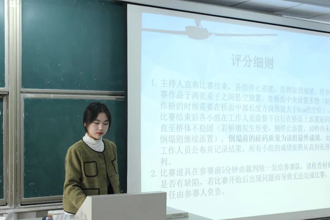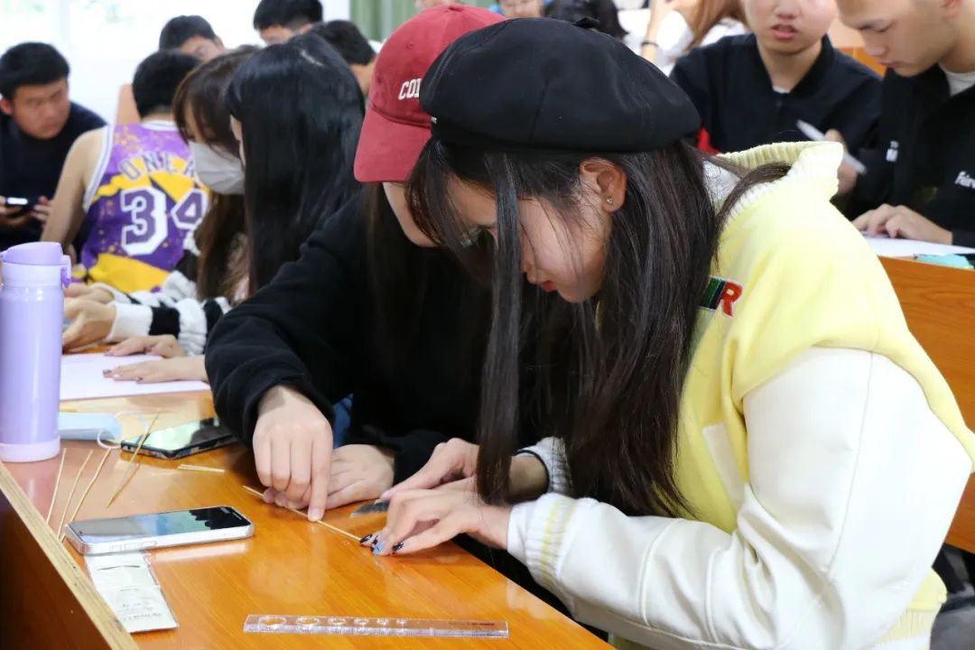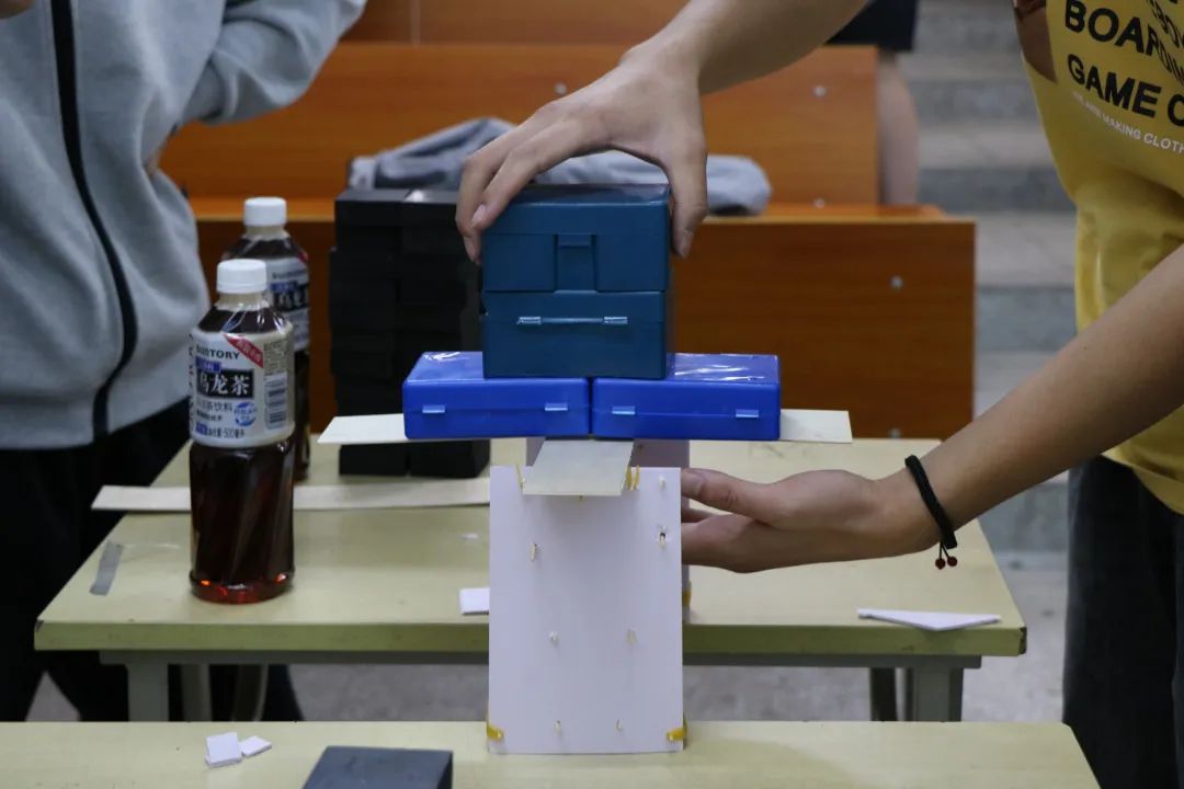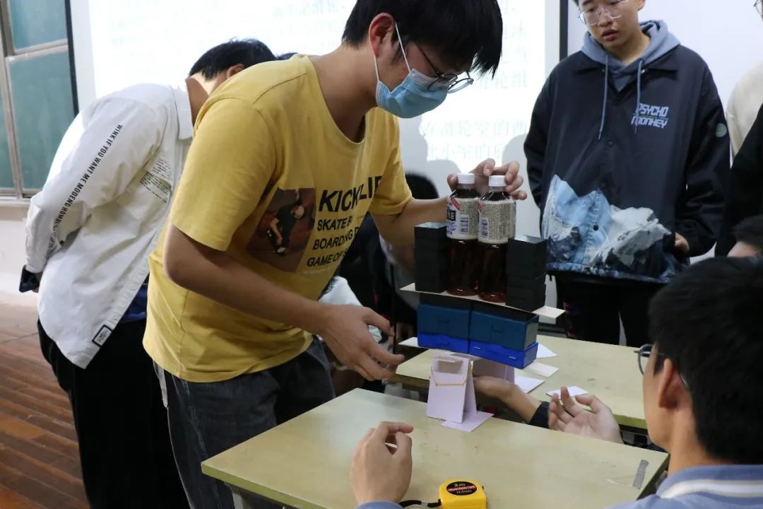在第一轮活动“跨海金梁”中,参赛小组需在规定时间内完成桥体的制作,各小组尽情展现着灵活的思维,碰撞出灵感的火花。活动时间截止,各小组有序地带着作品上台进行承重检测。在测试过程中,各小组阐述了他们的创作理念,运用各自掌握的物理知识来讲解各自桥墩的巧妙设计,从而使桥体能够承受更大的重量。