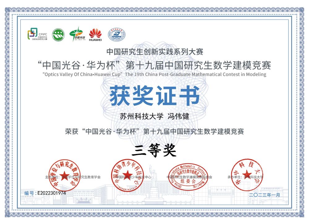 作者:王烽圣 发布日期:2023-02-23 浏览:次2022年10月6日至10日,“中国光谷·华为杯”第十九届中国研究生数学建模竞赛顺利举行。本届竞赛吸引国外和国内各省(自治区、直辖市、特别行政区)共465个研究生培养单位的17970队研究生参赛,历经近两个月的严谨阅评,近日获奖名单揭晓,我院研究生冯伟健在本次竞赛中获得三等奖。