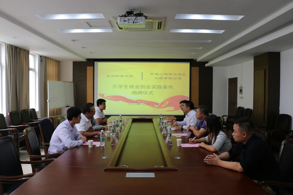 中建二局三公司总经理助理、人力资源部经理戴强和NG28娱乐 党委副书记、副院长刘建峰代表双方签订了大学生就业创业实践基地合作协议,中建二局三公司华东区域副经理马泽琛和学生工作处副处长张承祖共同为基地揭牌。会后,双方就进一步的合作与交流进行了探讨。