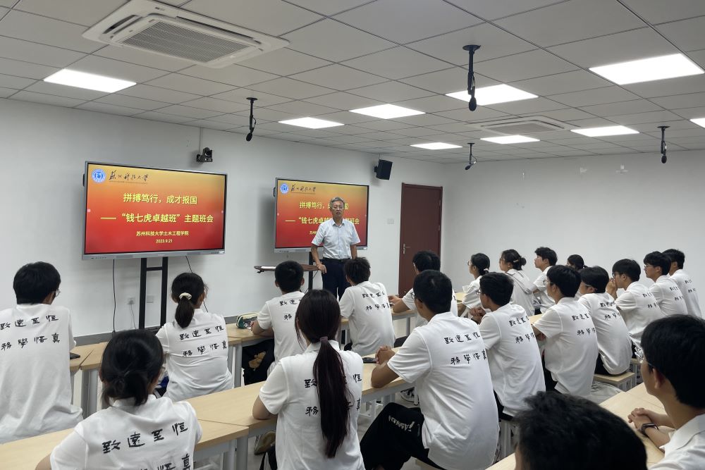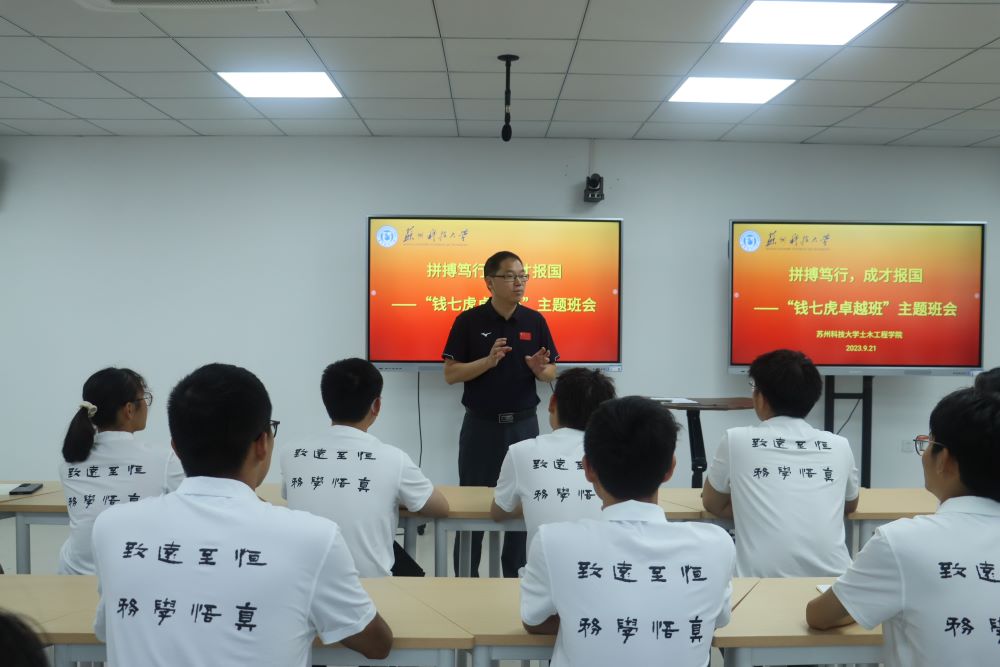 作者:宫淑阳 来源:NG28娱乐 发布日期:2023-09-22 浏览:次9月21日下午,一场以“拼搏笃行,成才报国”为主题的“钱七虎卓越班”主题班会在金螳螂楼智慧教室举行。“钱七虎卓越班”班主任、苏州科技大学党委常委、副校长唐柏鉴出席班会,与“钱七虎卓越班”全体同学座谈。“钱七虎卓越班”执行班主任、NG28娱乐 常务副院长赵宝成参加并主持班会。