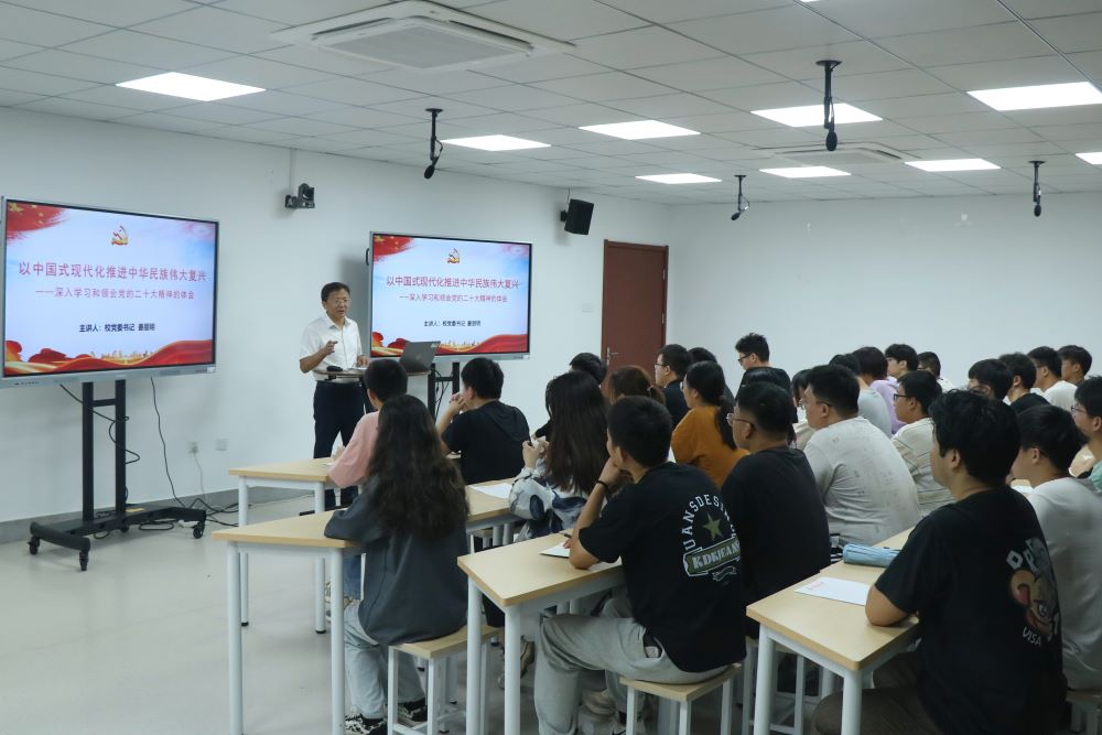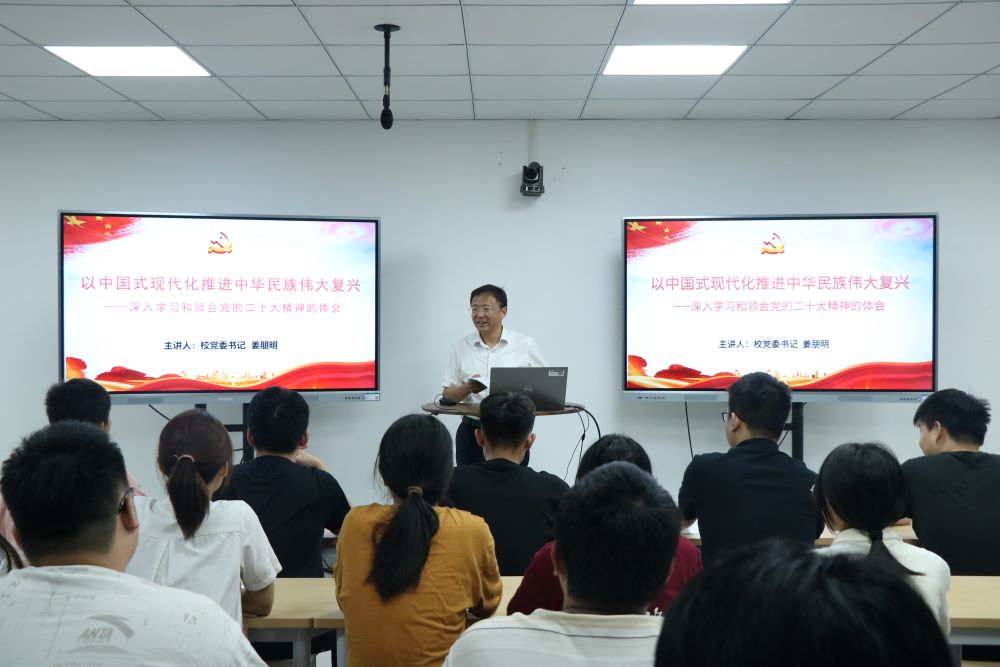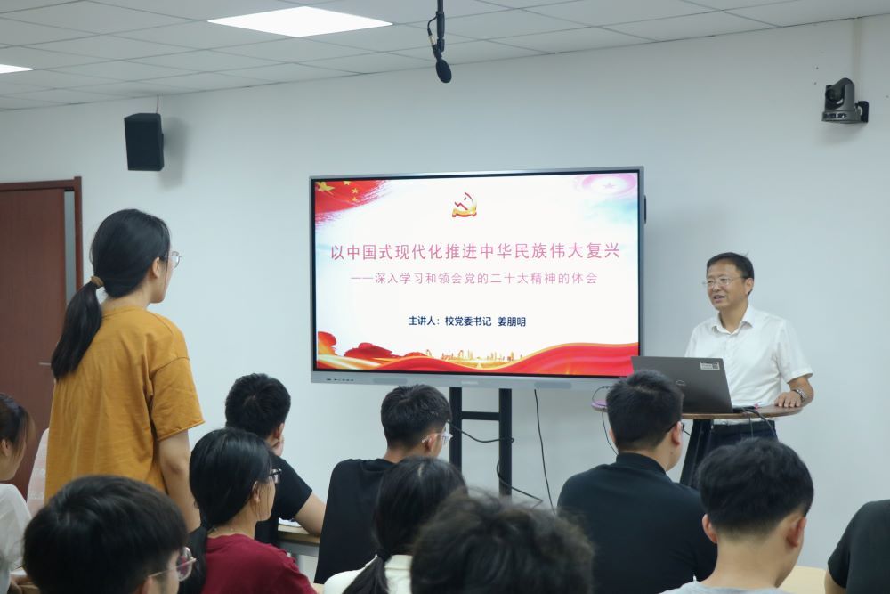 作者:许智琪 来源:NG28娱乐 发布日期:2023-07-06 浏览:次为全面系统深入学习领会党的二十大精神,引导广大青年昂扬青春斗志、实干担当有为,心怀“国之大者”,2023年7月6日上午,苏州科技大学校党委书记姜朋明以“中国式现代化推进中华民族伟大复兴——深入学习和领会党的二十大精神的体会”为题,在金螳螂楼智慧教室212为NG28娱乐 力学2111班学生讲授形势与政策课。