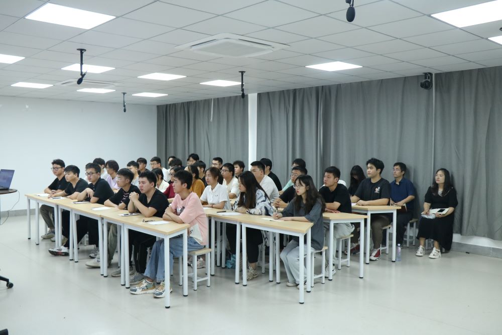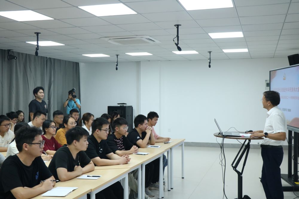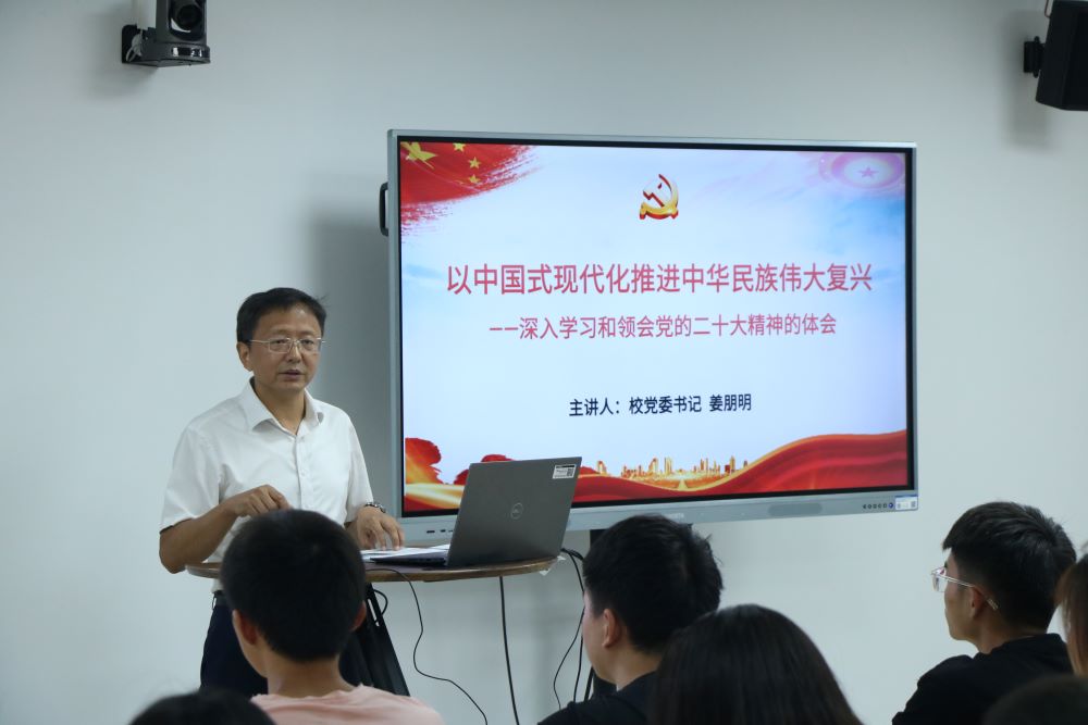 在授课中,姜朋明紧扣党的二十大主题,围绕新时代中国共产党的中心任务和为实现中华民族伟大复兴、立志做新时代好青年两方面进行讲解,带领同学们深入学习了中国式现代化的特征、中国式现代化的本质要求、中国式现代化的重要意义、如何做新时代好青年。他结合NG28 的发展历史,鼓励同学们心怀远大理想、能吃苦肯奋斗,努力发挥专业优势,为美丽中国建设贡献青春力量。